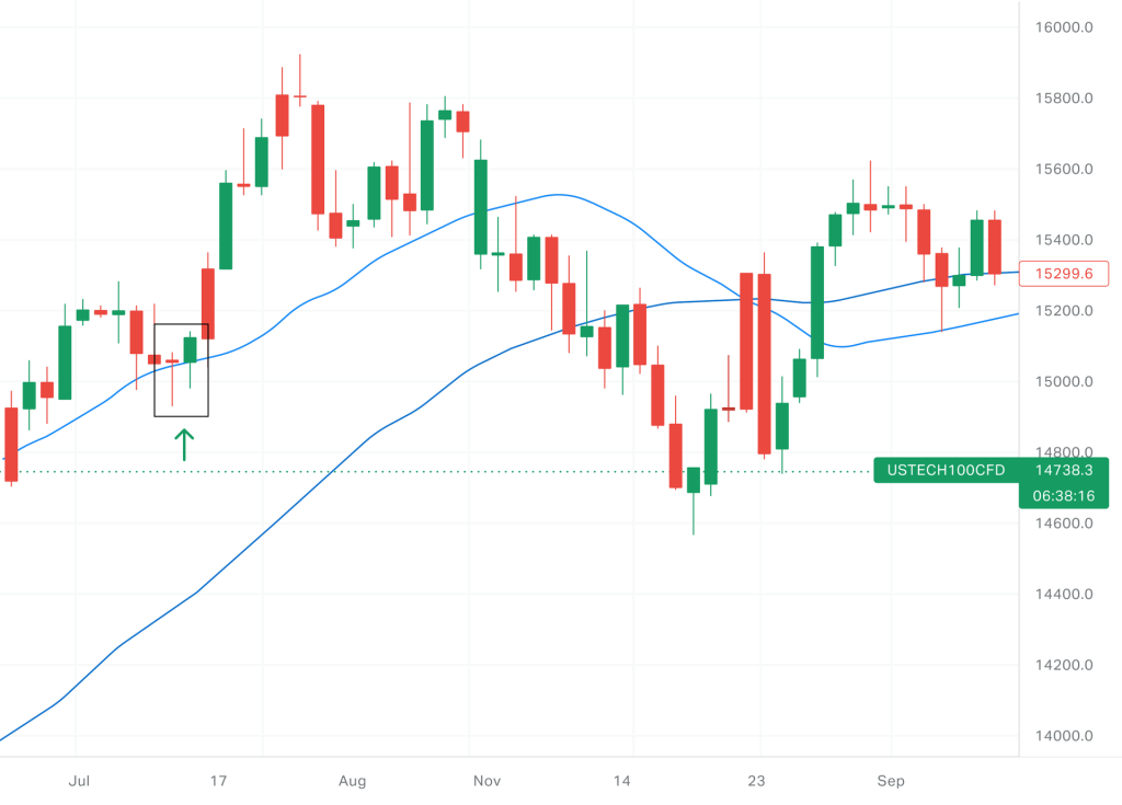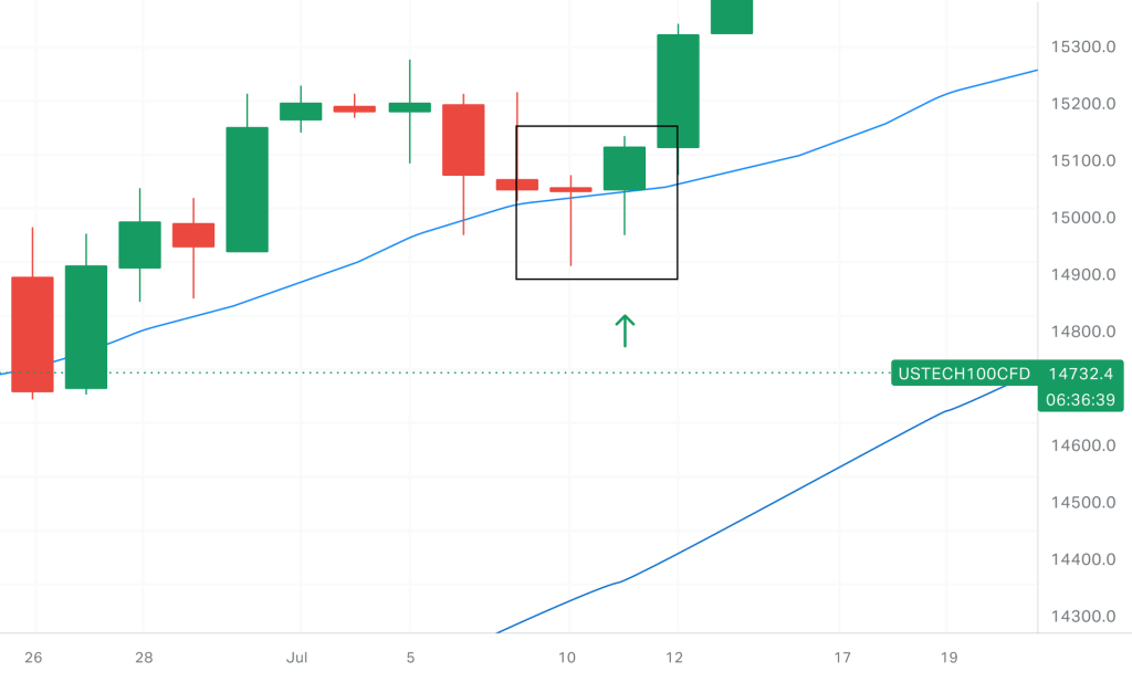 এখানে NASDAQ ইনডেক্স (USTEC) এর জন্য এই বুলিশ প্যাটার্নের একটি উদাহরণ দেওয়া হল, যা 2023 সালের জুলাই মাসে হয়েছিল। মূল্যটি একটি ডাইনামিক সাপোর্ট অঞ্চলে আঘাত করেছিল (20-দিন এবং 50-দিনের মুভিং অ্যাভারেজের সংমিশ্রণ), তারপরে এটি উপরের দিকে উল্টে যায় এবং বৃদ্ধি পেতে থাকে, যা একটি শক্তিশালী বুলিশ মার্কেটের ইঙ্গিত দেয়।