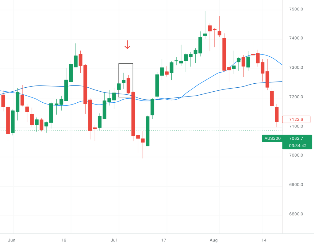 অস্ট্রেলিয়ান স্টক ইনডেক্স AUS200-এর জন্য একটি বিয়ারিশ এনগালফিং প্যাটার্নের উদাহরণ এখানে দেওয়া হল, যা 2023 সালের জুলাই মাসে হয়েছিল। মূল্য শুরুতে ডায়নামিক রেজিস্ট্যান্স এরিয়ার উপরে উঠেছিল (20-দিন থেকে 50-দিনের মুভিং অ্যাভারেজের মধ্যে), কিন্তু তারপরে $7200 থেকে ব্যাপকভাবে নেমে গিয়েছিল। একটি বিয়ারিশ প্যাটার্নের কারণে $7000।