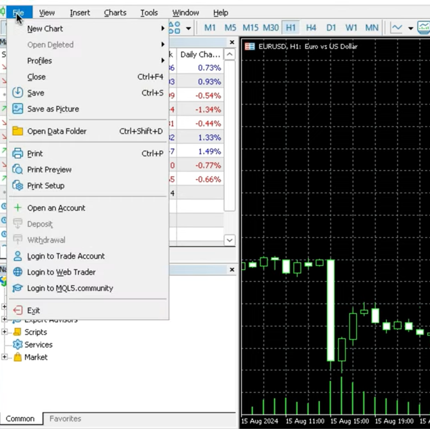 এখন আপনার একাউন্টে লগিন করতে হবে। লগিন করার জন্য মেনুতে যান। File এ ক্লিক করুন, তারপর Login to trade account এ ক্লিক করুন।