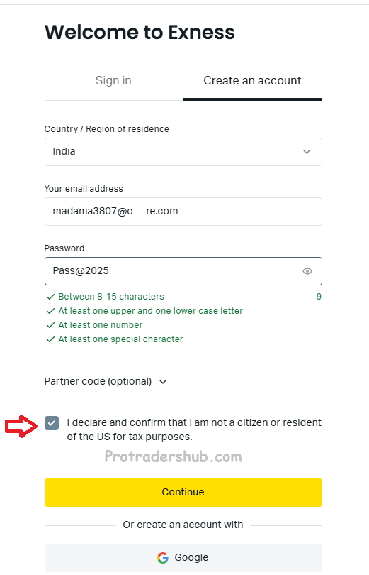 পাসওয়ার্ডের ঘরে আপনি আপনার পছন্দমতো একটি পাসওয়ার্ড দিন। মনে রাখবেন, পাওয়ার্ডে অবশ্য একটা বড় হাতের অক্ষর, একটা ছোট হাতের অক্ষর, একটা সংখ্যা এবং একটা চিহ্ন থাকতে হবে। যেমন Pass@2025. আপনি আবার এই পাসওয়ার্ডটাই ব্যবহার করবেন না। তারপর লাল তীর চিহ্নিত ঘরে টিক মার্ক দিয়ে Continue বাটনে ক্লিক করুন।