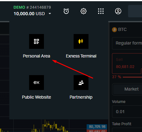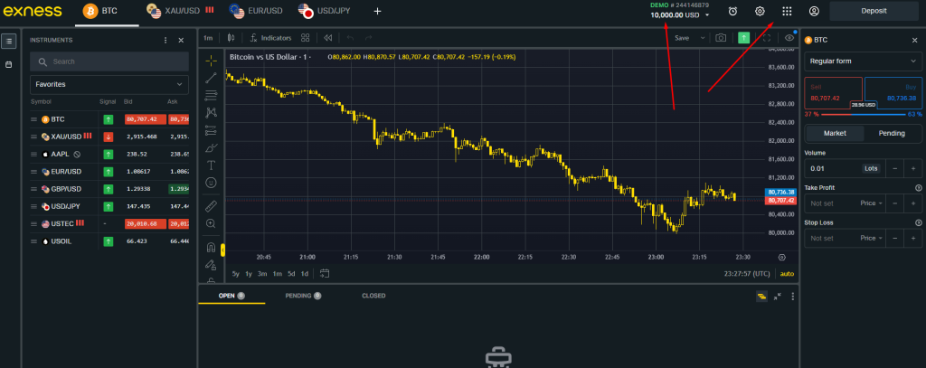 এরপর উপরের ছবির মতো একটা উইন্ডো আসবে। অভিনন্দন… আপনার একাউন্ট খোলা হয়ে গেছে। বাম পাশের লাল তীর চিহ্নত স্থানে দেখুন আপনার দশ হাজার ডলার ফান্ড শো করছে। এটা ডেমো ফান্ড। ২য় লাল তীর চিহ্নিত নাইন ডট মেনুতে ক্লিক করুন।