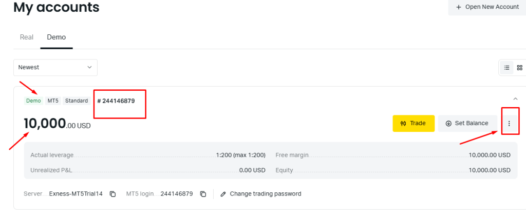 আপনার ডেমো একাউন্ট নাম্বার ব্যালেন্স শো করছে। এখন ডান পাশের থ্রী ডট মেনুতে ক্লিক করুন।