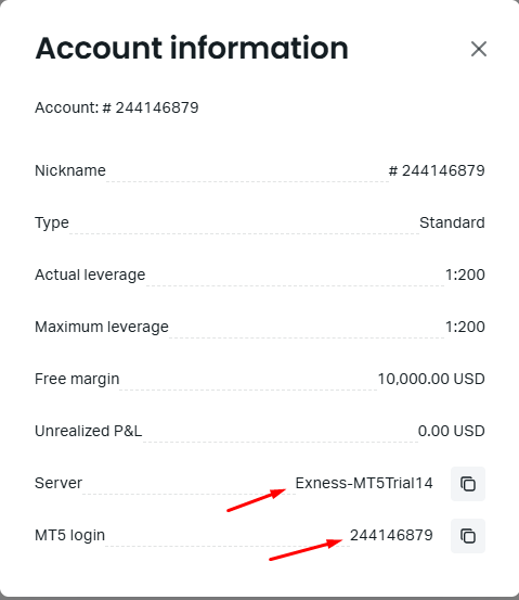 আপনার বর্তমান ডেমো একাউন্টের সকল ইনফরমেশন এখানে দেখাবে। ডেমো ট্রেড করতে হলে আপনার ৩ টা ইনফরমেশন লাগবে। এখানে তীর চিহ্নত ২টা ইনফরমেশন দেখাচ্ছে ১. সার্ভার ২. লগিন আইডি বা আপনার একাউন্ট নাম্বার। ৩. আপনার একাউন্টের পাসওয়ার্ড, যেটা একাউন্ট খোলার সময় দিয়েছিলেন। যদি ভুলে যান তাহলে ১ মিনিটের মধ্যে সেটা চেঞ্জ করে নিতে পারবেন। নিচের চিত্র দেখুন।