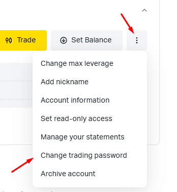 নাইন ডট মেনুতে গিয়ে Change Trading password এ ক্লিক করুন। তারপর আপনার পছন্দমতো পাসওযার্ড সেট করে নিন।