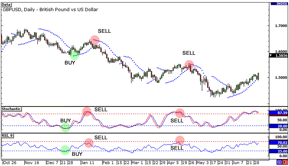 এপ্রিল মাসের দ্বিতীয় সপ্তাহের দিকে, Stochastic এবং RSI দুইটি ইন্ডিকেটরই নতুন করে Sell সিগন্যাল প্রদান করে যেখানে Parabolic SAR ইন্ডিকেটর কোনও ধরনের ট্রেড এন্ট্রির সিগন্যাল প্রদান করেনি।