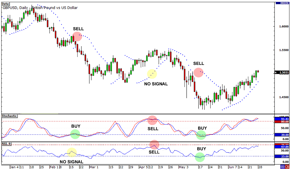 চার্ট অনুযায়ী, ফেব্রুয়ারি মাসের মাঝে এসে Parabolic SAR ইন্ডিকেটর আমাদের একটি Sell সিগন্যাল প্রদান করে যেখানে Stochastic ইন্ডিকেটর আমাদের ঠিক এর বিপরীত অর্থাৎ Buy সিগন্যাল প্রদান করেছে। এখন প্রশ্ন হচ্ছে, আপনি কোন ইন্ডিকেটর অনুযায়ী ট্রেড করবেন? অন্যদিকে RSI ইন্ডিকেটর নিউট্রাল অবস্থানে রয়েছে এবং কোনও ধরনের সিগন্যাল প্রদান করেনি।
