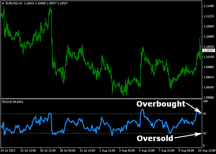 - ৭০ এর উপরে RSI: মার্কেটে কেনার প্রবণতা অত্যধিক হলে, প্রাইস ডাউনট্রেন্ডে যেতে পারে। ট্রেডাররা এই অবস্থায় বিক্রি (Sell) করার সিদ্ধান্ত নেয়।
