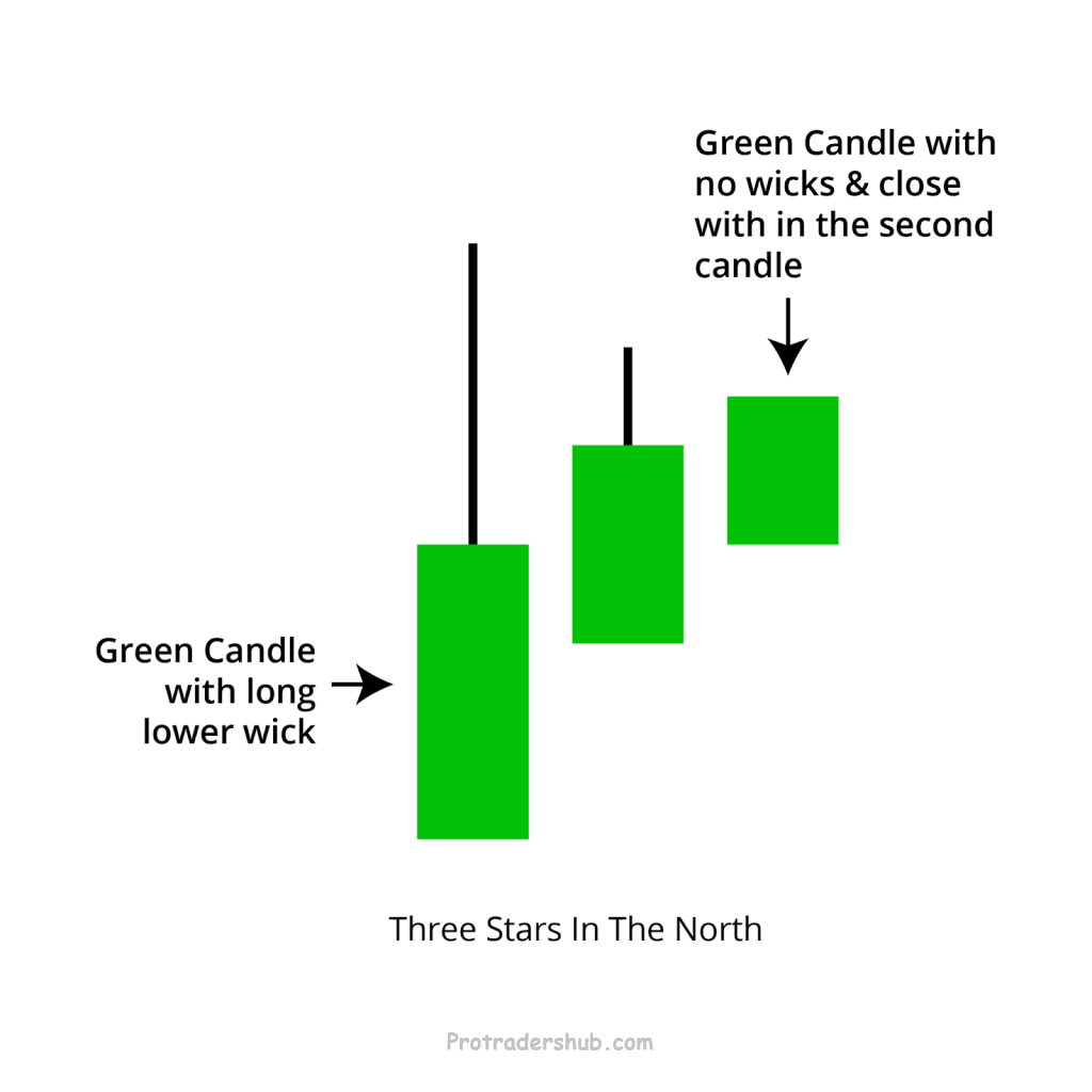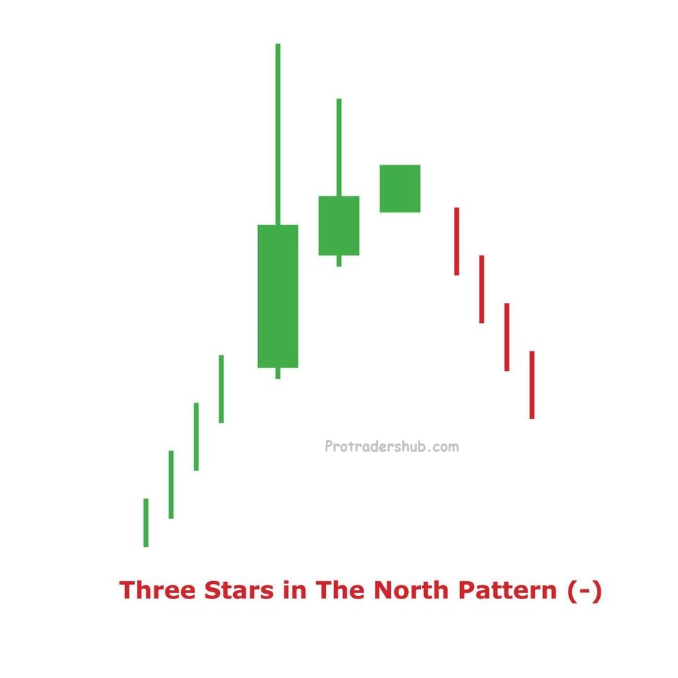 থ্রী স্টারস ইন দা নর্থ ক্যান্ডলস্টিক প্যাটার্ন হলো একটি ট্রেন্ড রিভার্সাল প্যাটার্ন যা মার্কেটে একটি ডাউনট্রেন্ড বা বিয়ারিশ মুভমেন্টের শেষে দেখা যায়। এটি সংকেত দেয় যে বুলস মার্কেটে প্রবেশ করেছে এবং দাম বাড়তে শুরু করতে পারে। এই প্যাটার্নটি তিনটি ক্যান্ডেলের একটি সেট নিয়ে গঠিত যা বাজারের বিপরীত দিকে একটি নির্দিষ্ট ধরণের মুভমেন্ট প্রদর্শন করে।