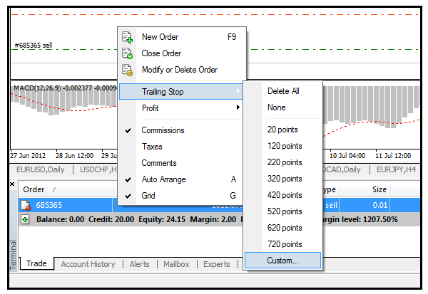 ট্রেইলিং স্টপ ব্যবহার করার জন্য প্রথমে Terminal টি ওপেন করতে হবে, এরপরে যেই ট্রেডে ট্রেইলিং স্টপ আপনি সেট করতে চান সেই ট্রেডের উপর মাউস রেখে রাইট ক্লিক করে Default অথবা, Custom ট্রেইলিং স্টপ আপনি সেট করে দিতে পারেন, নীচের মত করে ।