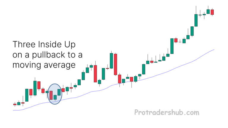 - নির্ভুলতা বাড়ানোর জন্য, আপনি থ্রী ইনসাইড আপ প্যাটার্নটি পুলব্যাক, মুভিং এভারেজ এবং অন্যান্য ট্রেডিং সূচক ব্যবহার করে ট্রেড করতে পারেন।