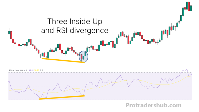 উপরের দুইটি উদাহরনের মতো এখানেও RSI কনফার্মেশনের সাথে একটি থ্রী ইনসাইড আপ তৈরি হয়েছে। যার ফলে এখানেও সুন্দরভাবে কাজ করেছে এবং ট্রেডারদের ভালো প্রফিট দিয়েছে।