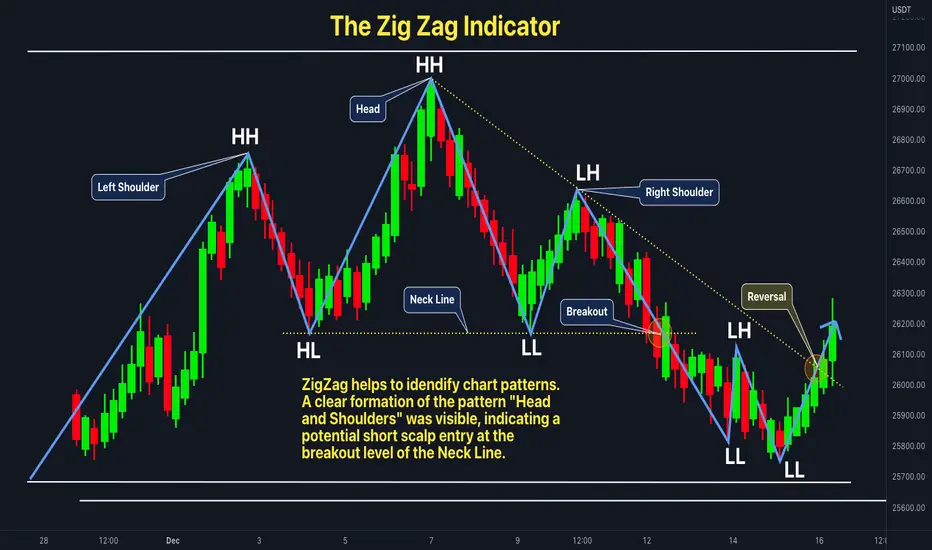 জিগজ্যাগ ইন্ডিকেটর একটি টেকনিক্যাল অ্যানালাইসিস টুল, যা মার্কেটের ছোটখাটো প্রাইস পরিবর্তনগুলোকে ফিল্টার করে বড় প্রাইস মুভমেন্টগুলোকে হাইলাইট করে। এটি ট্রেন্ড রিভার্সাল সনাক্ত করা, ফিবোনাচ্চি রিট্রেসমেন্ট লেভেল নির্ধারণ এবং চার্ট প্যাটার্ন (যেমন, এলিয়ট ওয়েভ) চিনতে সাহায্য করে।